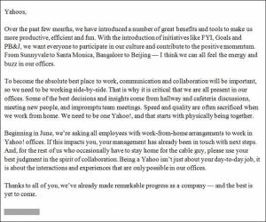 What if you received an e-mail from your boss declaring that you, along with all other employees, were no longer allowed to work remotely? That was the reality for hundreds of Yahoo employees recently after they received an e-mail informing them of the required shift from home to office.